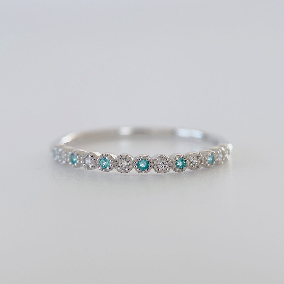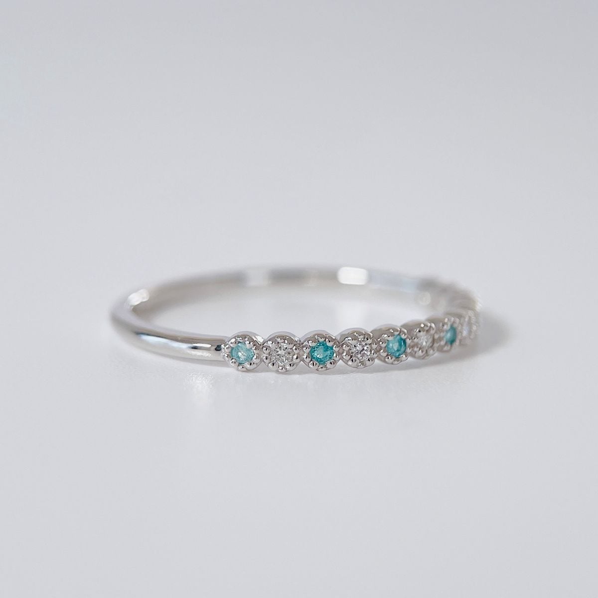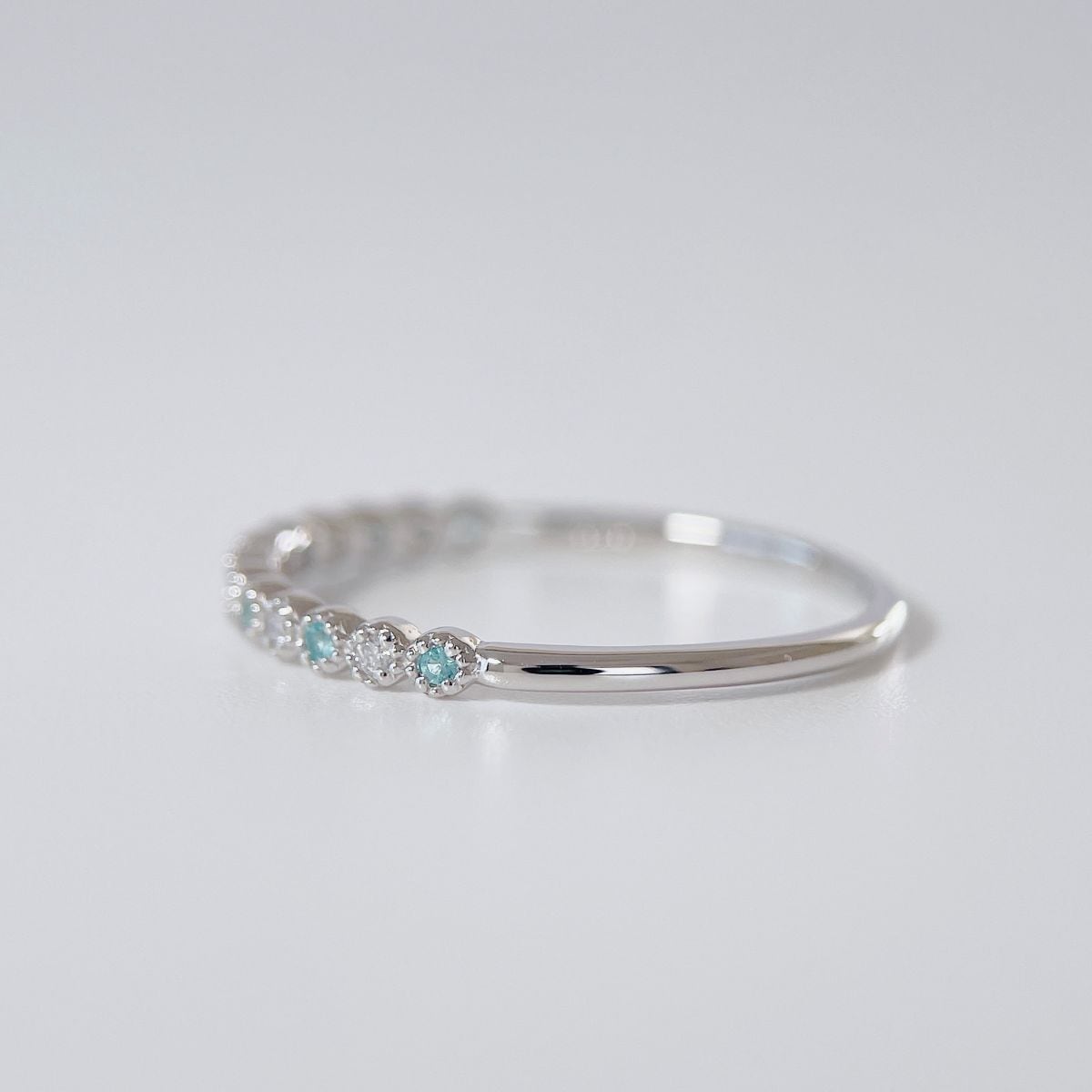 パライバトルマリンと、上質な天然ダイヤモンドを交互にセッティングし、指先に瑞々しい輝きを添えます。