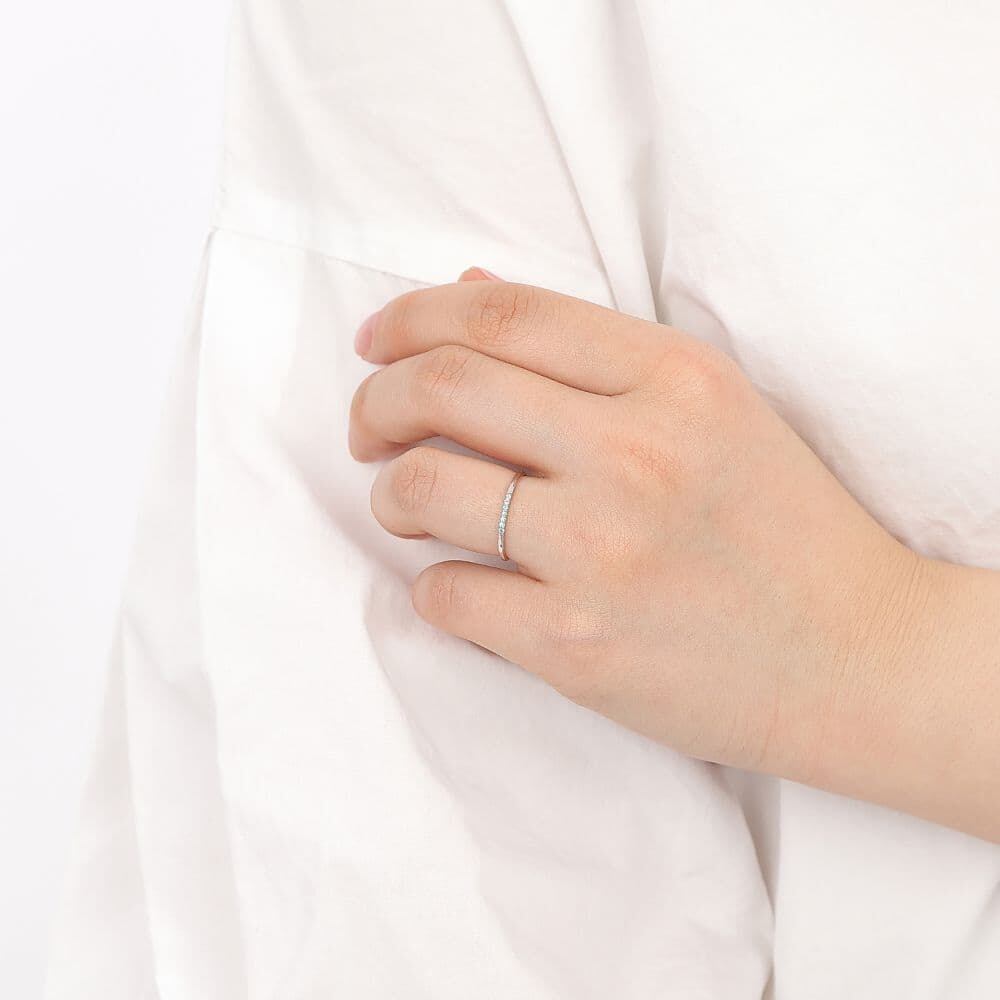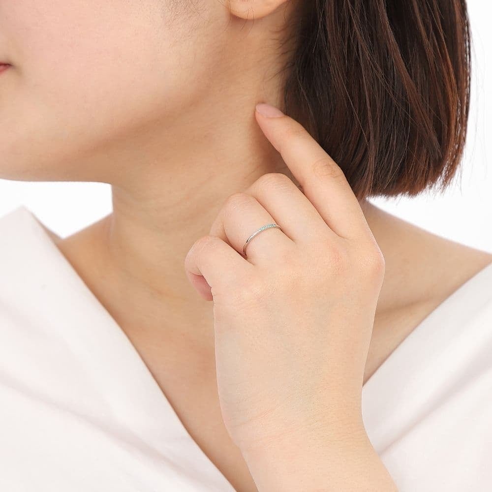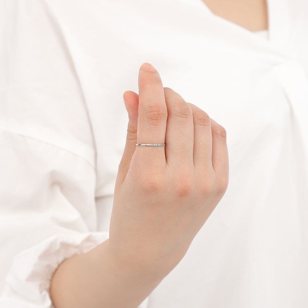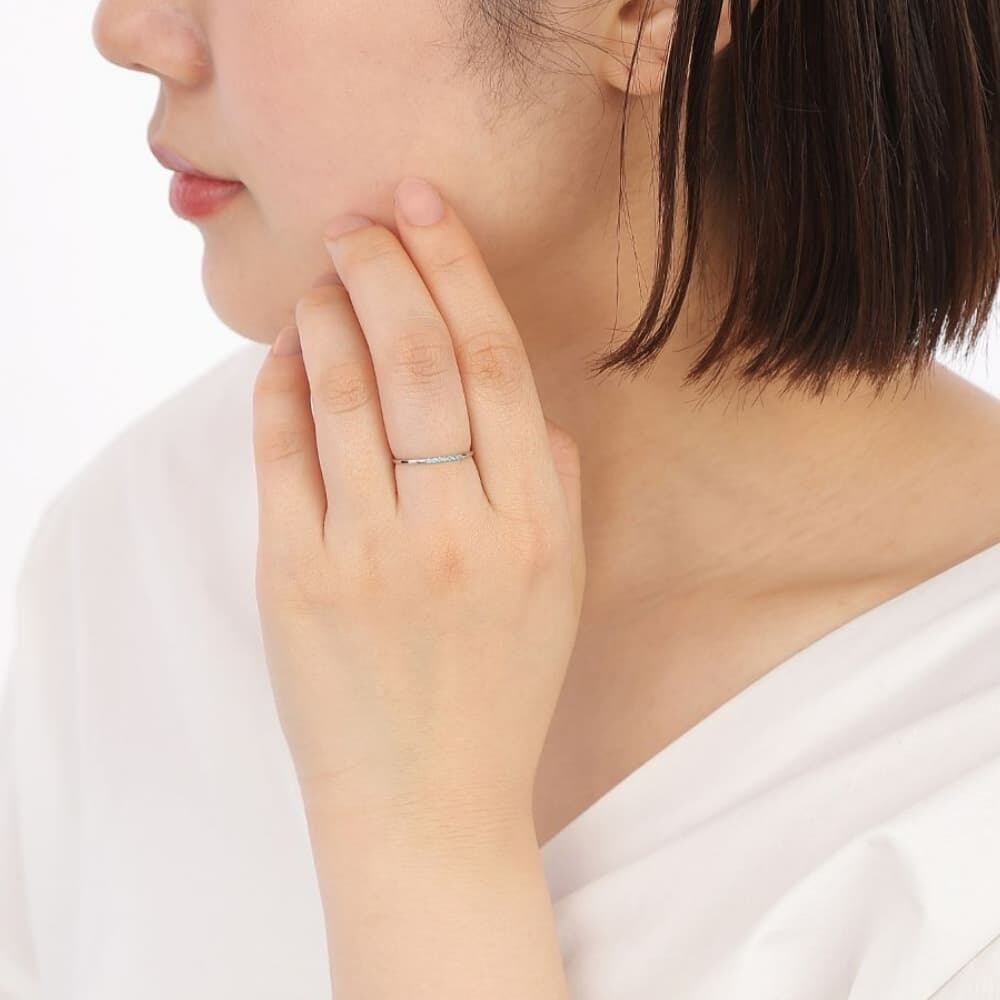 トータル約0.03ct、繊細なサイズながらも確かな存在感を放ち、指元に澄み渡るようなブルーの光を添えます。