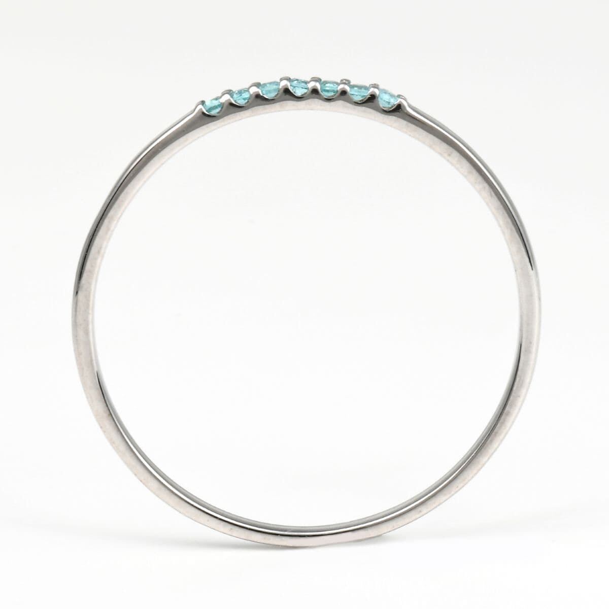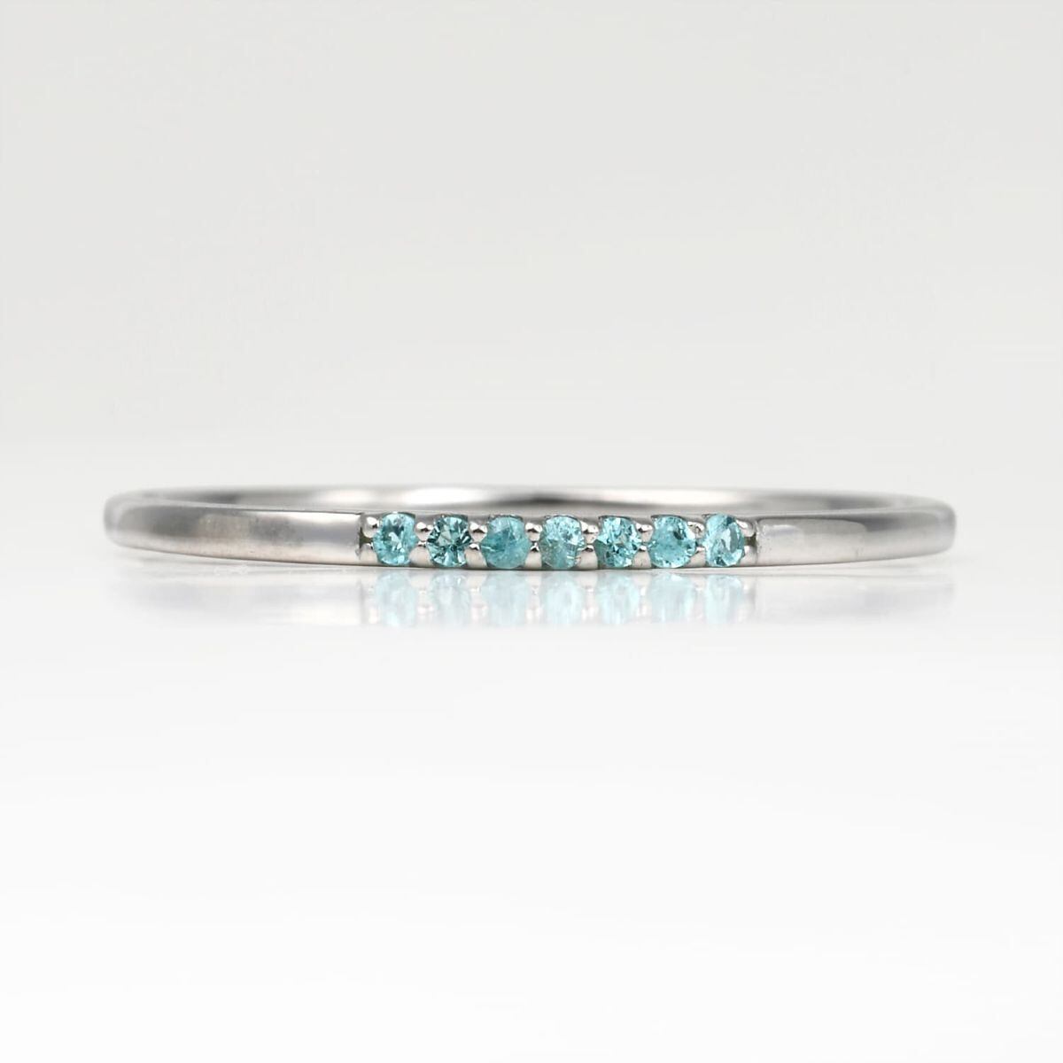 ネオンのように鮮やかな輝きを放つ、パライバトルマリンを7石一列にセッティングしたラインリング。