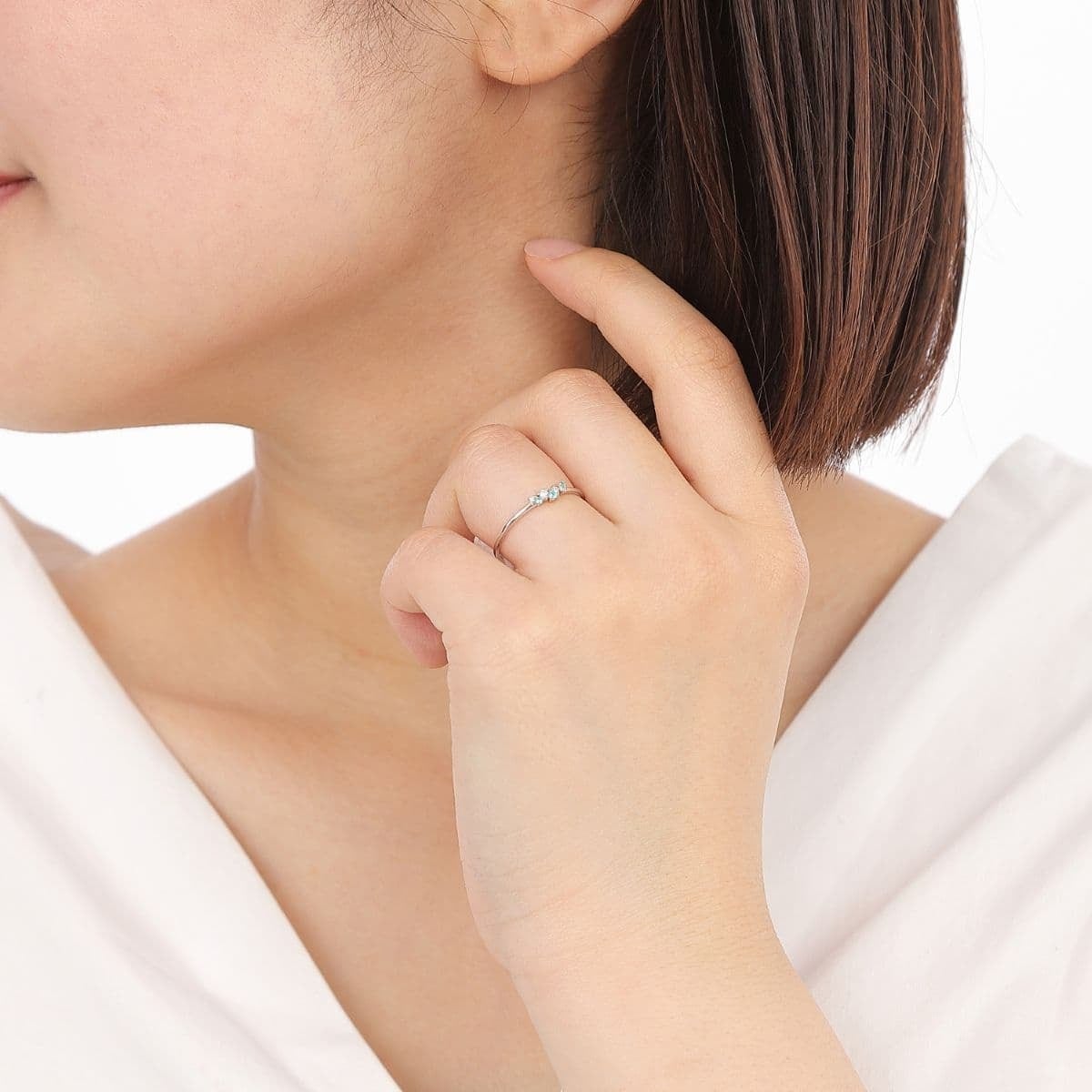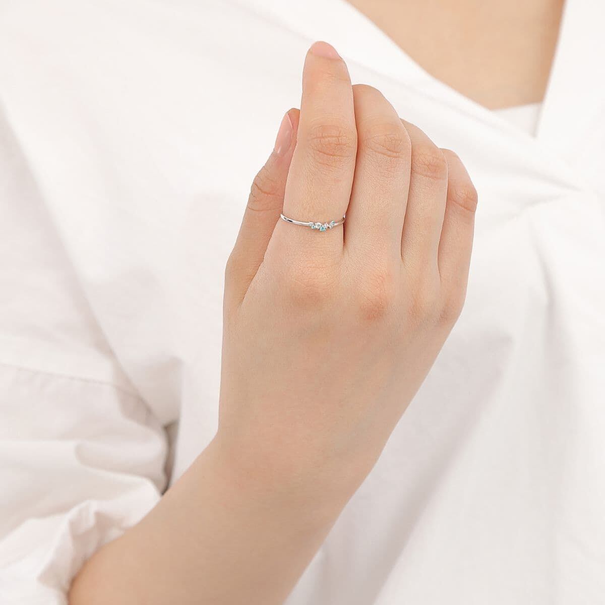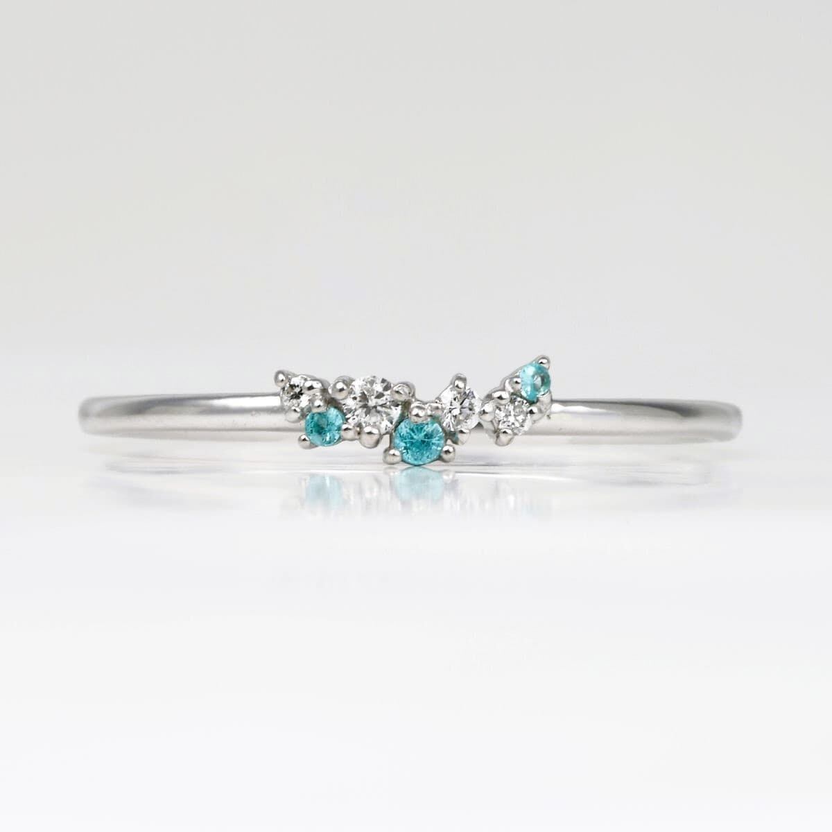 爽やかなネオンブルーのパライバトルマリンと、凛としたダイヤモンドの輝きが重なり合い、指元に洗練された華やぎを添えます。
